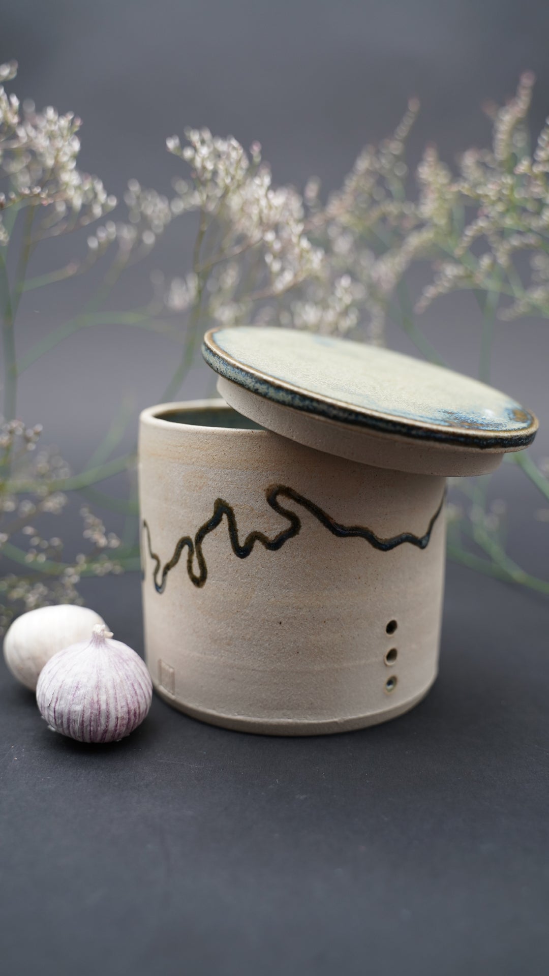 Die Löcher an den Seiten sorgen für eine gute Durchlüftung der Zwiebeln/ des Knoblauchs. 2 der 6 Löcher sind beim Glasurbrand verklebt, daher B-Ware.